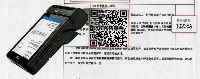 “购房者在缴款时,开发企业提供一张带有二维码和转账核验码的确认单,其中,二维码是针对POS刷卡缴费购房者的,转账核验码主要提供给柜台或者手机银行转账的用户,两种方式都能实现资金的精准入账。”济南市住房和城乡建设局相关负责人介绍,推行“扫码买房”后,无论是扫码还是备注核验码转账,购房款项均直接存入预售资金监管账户。