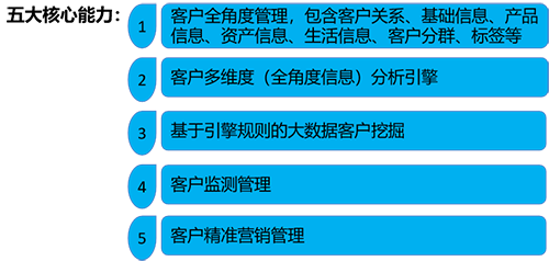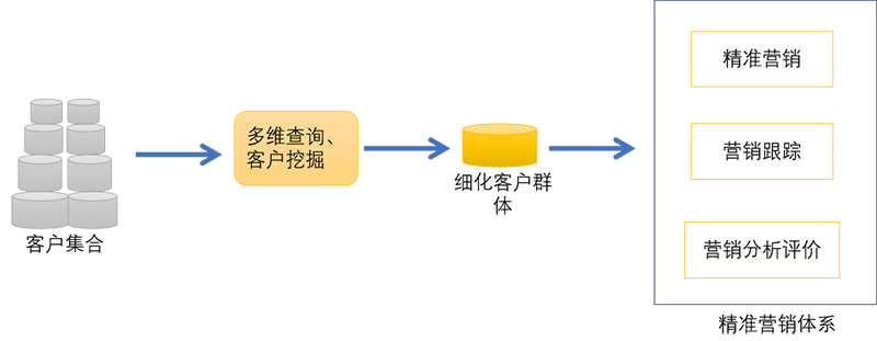 依托大数据和数据挖掘应用,在客户分群、客户画像、客户标签库及营销规则库的基础上,建立营销全流程管理,协助金融机构实现以数据驱动的精准营销模式。